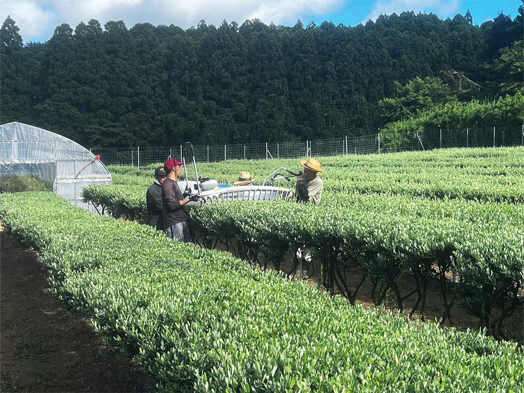 夏の青空がまぶしく広がる中、今年のオリーブティー2番茶の摘み取りが始まりました。